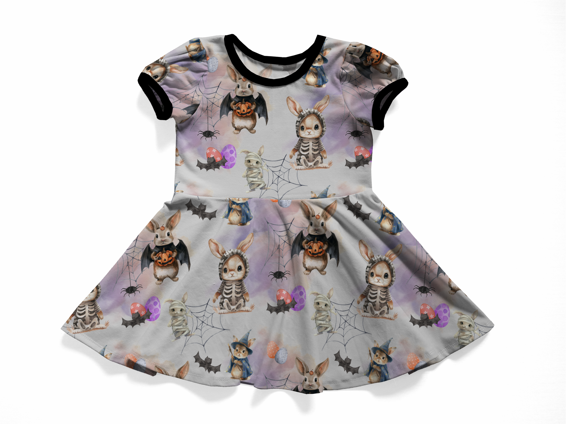 Our Skater Dresses combine soft spring prints with bold black contrast neckband and sleeve bands/cuffs — the perfect balance of sweet and spooky.