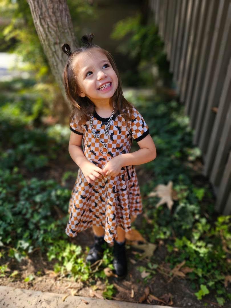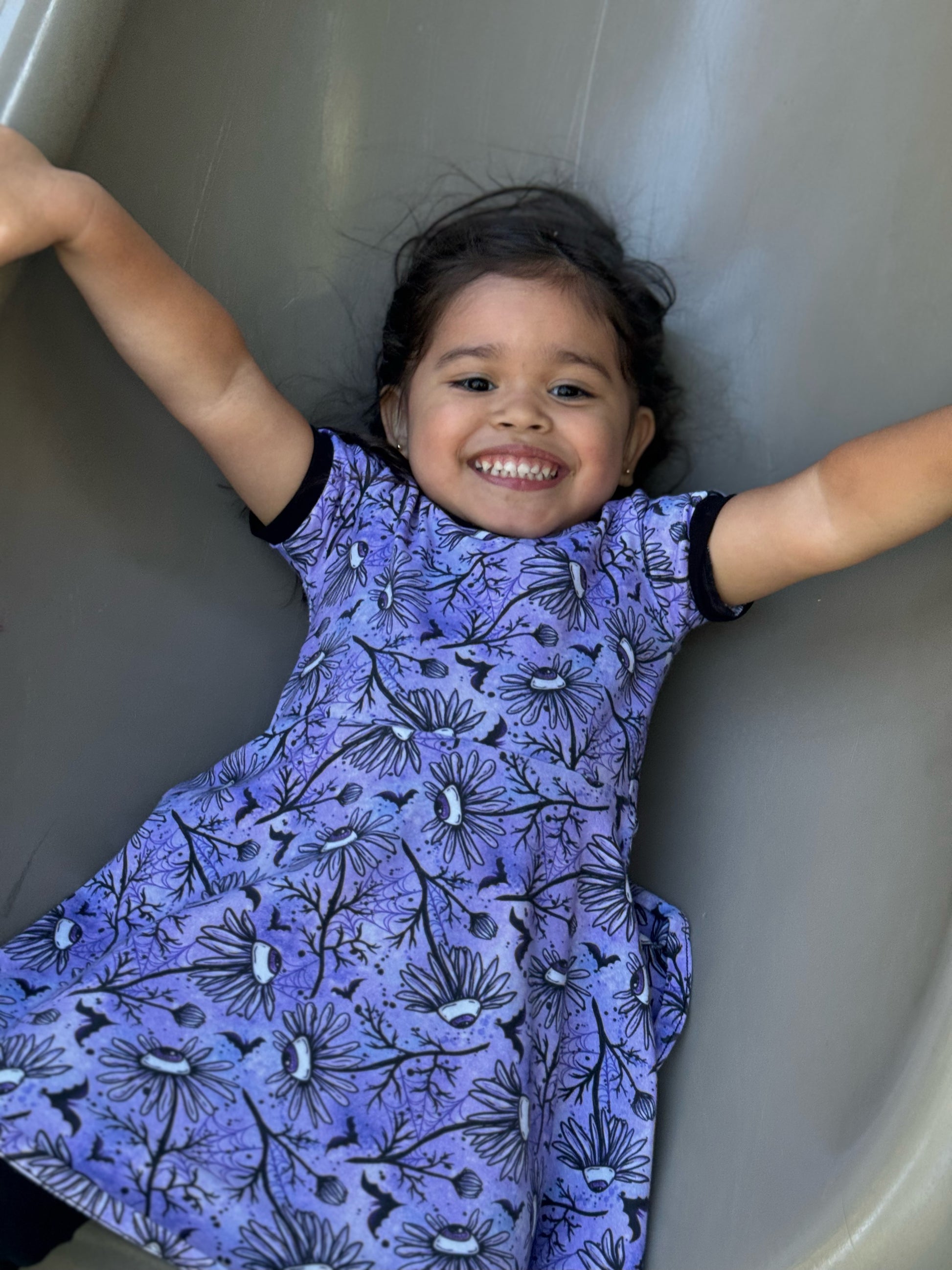 Our Skater Dresses combine soft spring prints with bold black contrast neckband and sleeve bands/cuffs — the perfect balance of sweet and spooky.