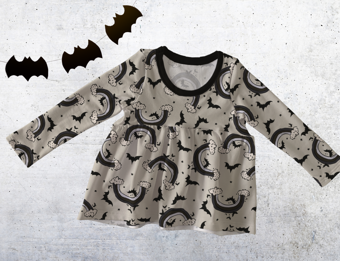 I ordered these sleeveless because… so cal, and I am obssessed with the way it fits and looks on my ghouls. The thing about choosing this fabric pattern is that the black trim stands out and it really makes the design of the bats and rainbows pop! They got so many compliments on these shirts. I really, really love the way these little tops came out.