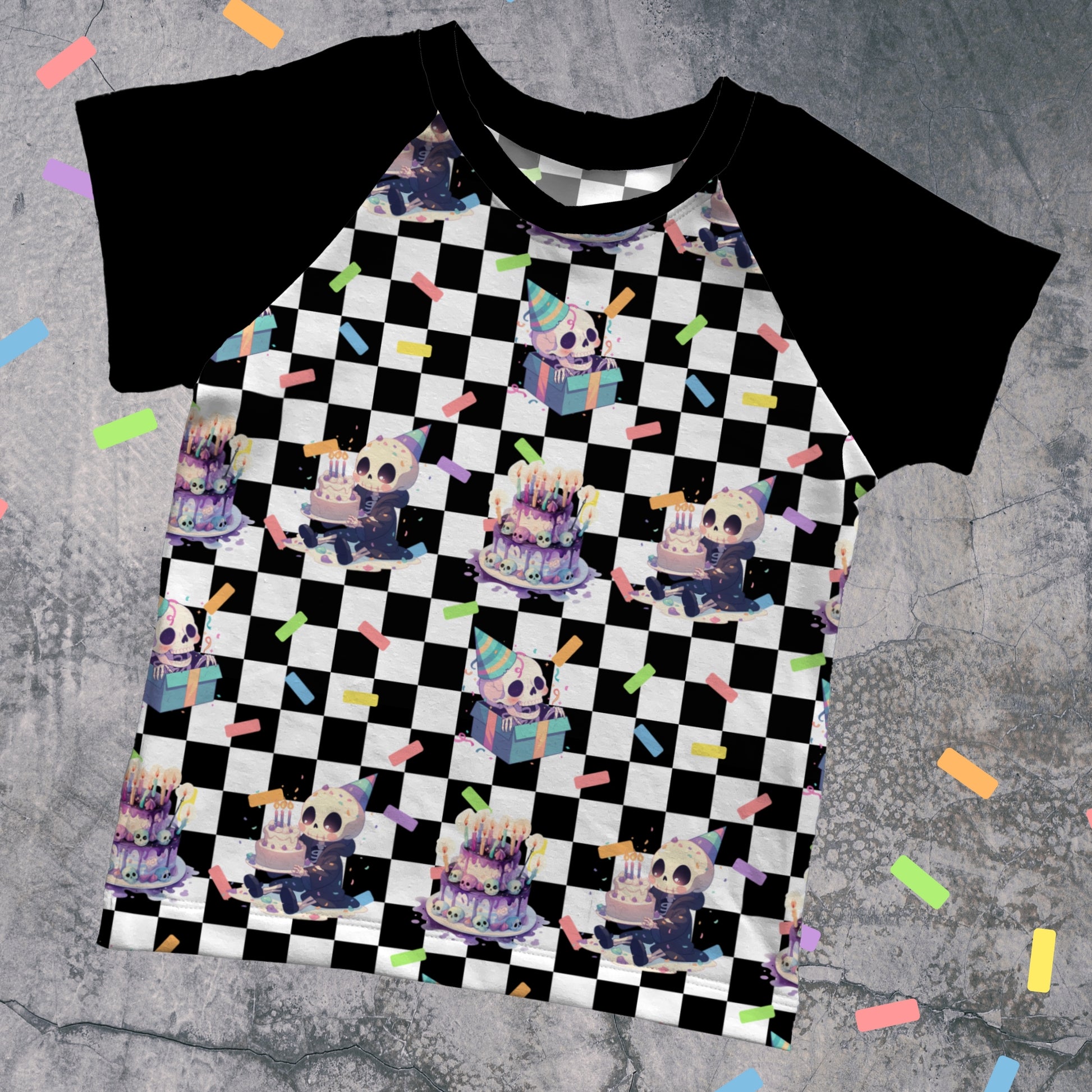 This Spooky Birthday raglan T-Shirt features our exclusive birthday print with cute little ghouls, creepy cakes, and party vibes — perfect for kids who don’t do basic birthdays.