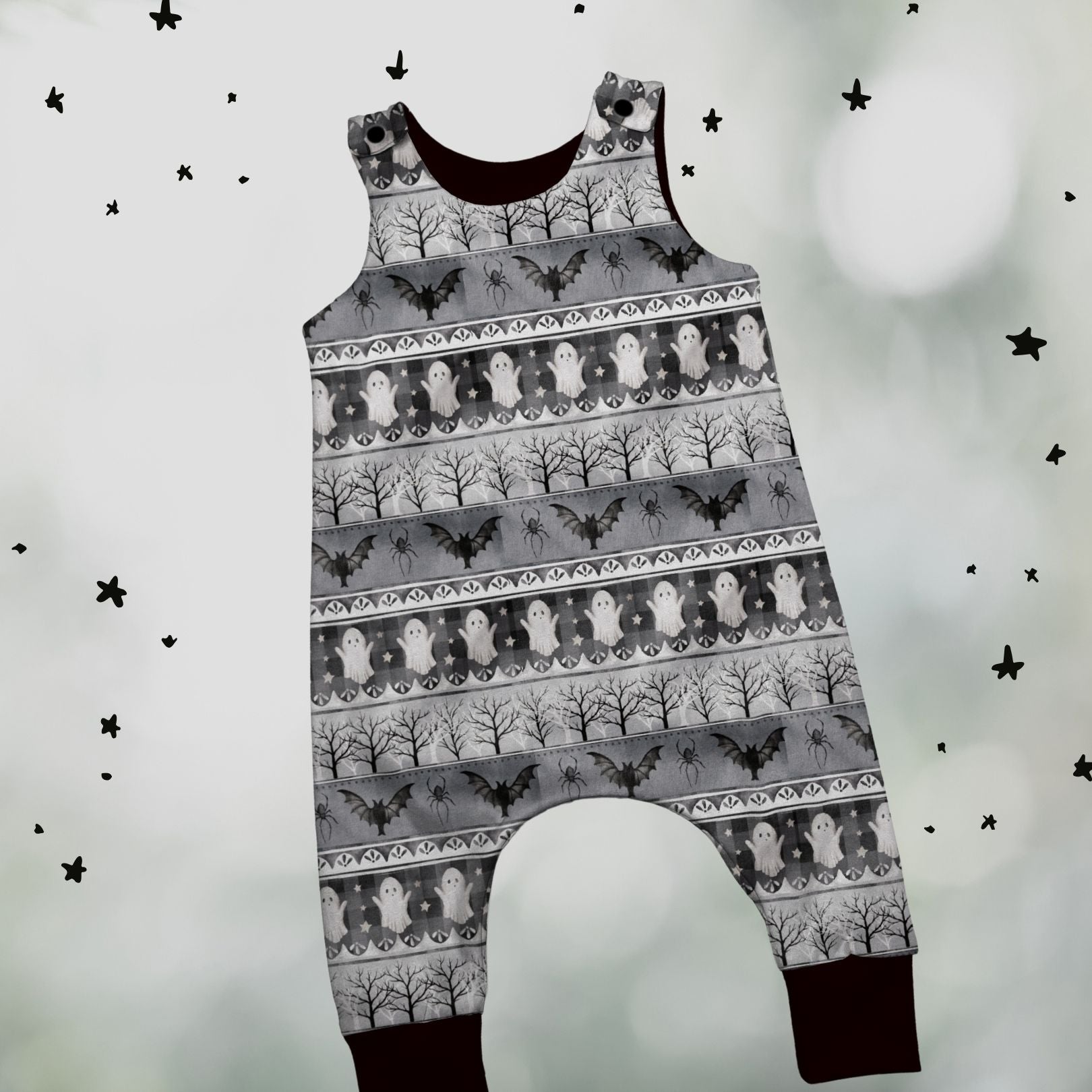 This harem romper is crafted from soft, cozy fabric with adorable eerie holiday prints.