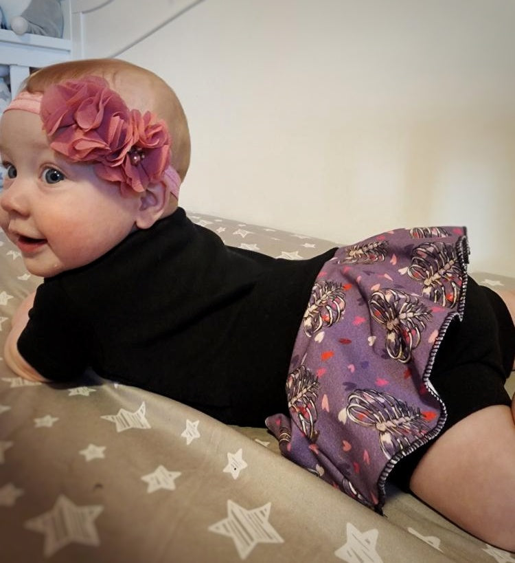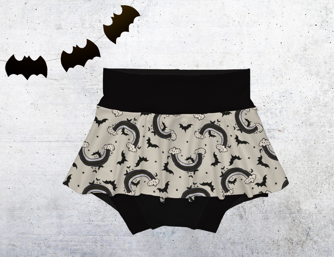 These adorably spooky skirted bummies are (hand)made from medium-weight jersey with plenty of stretch for comfy wear.