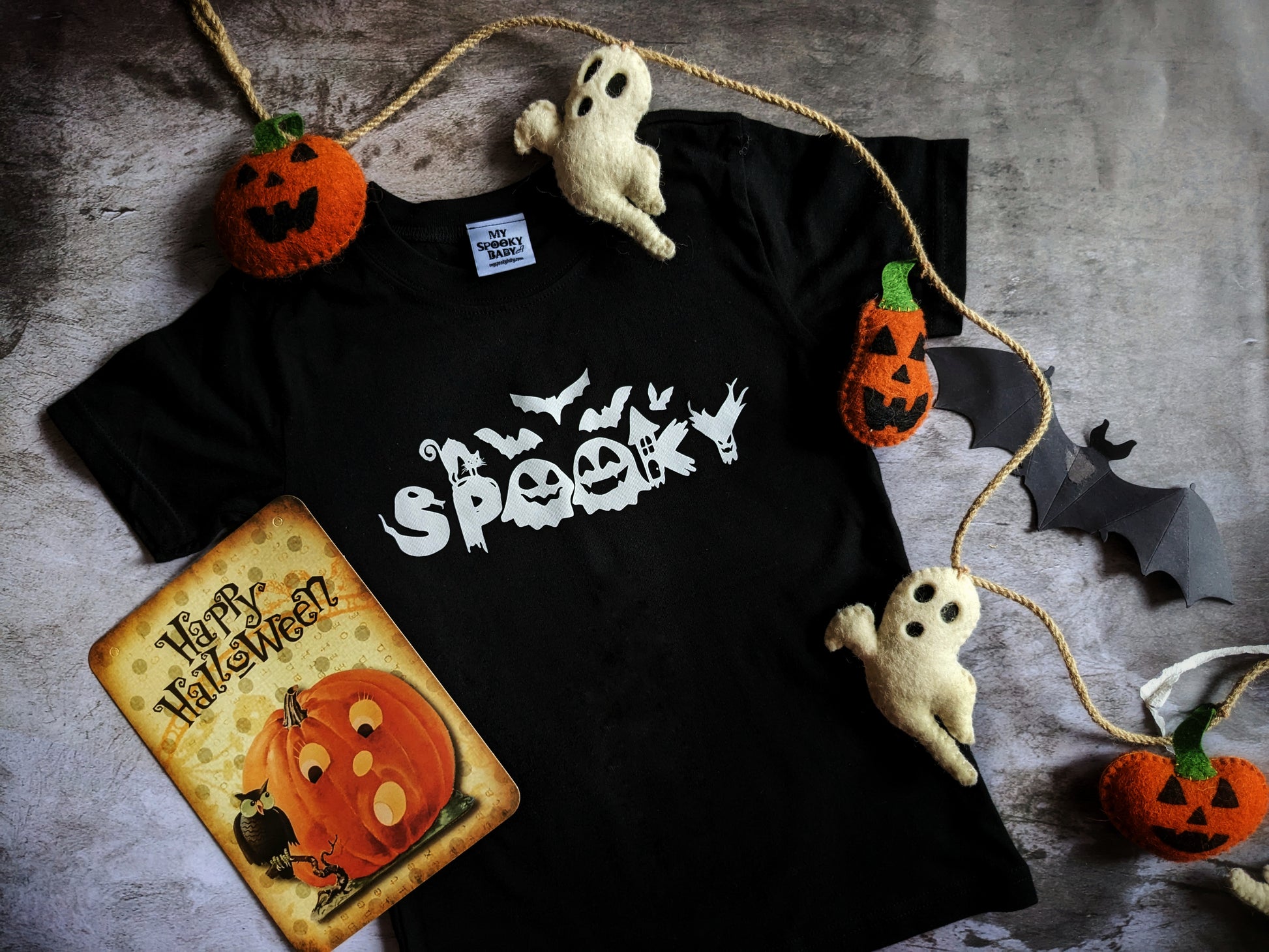 Featuring the word āSpookyā spelled out with Halloween iconsāpumpkins, bats, haunted houses, and moreāthis playful design is perfect for little ones joining in on the Halloween fun.